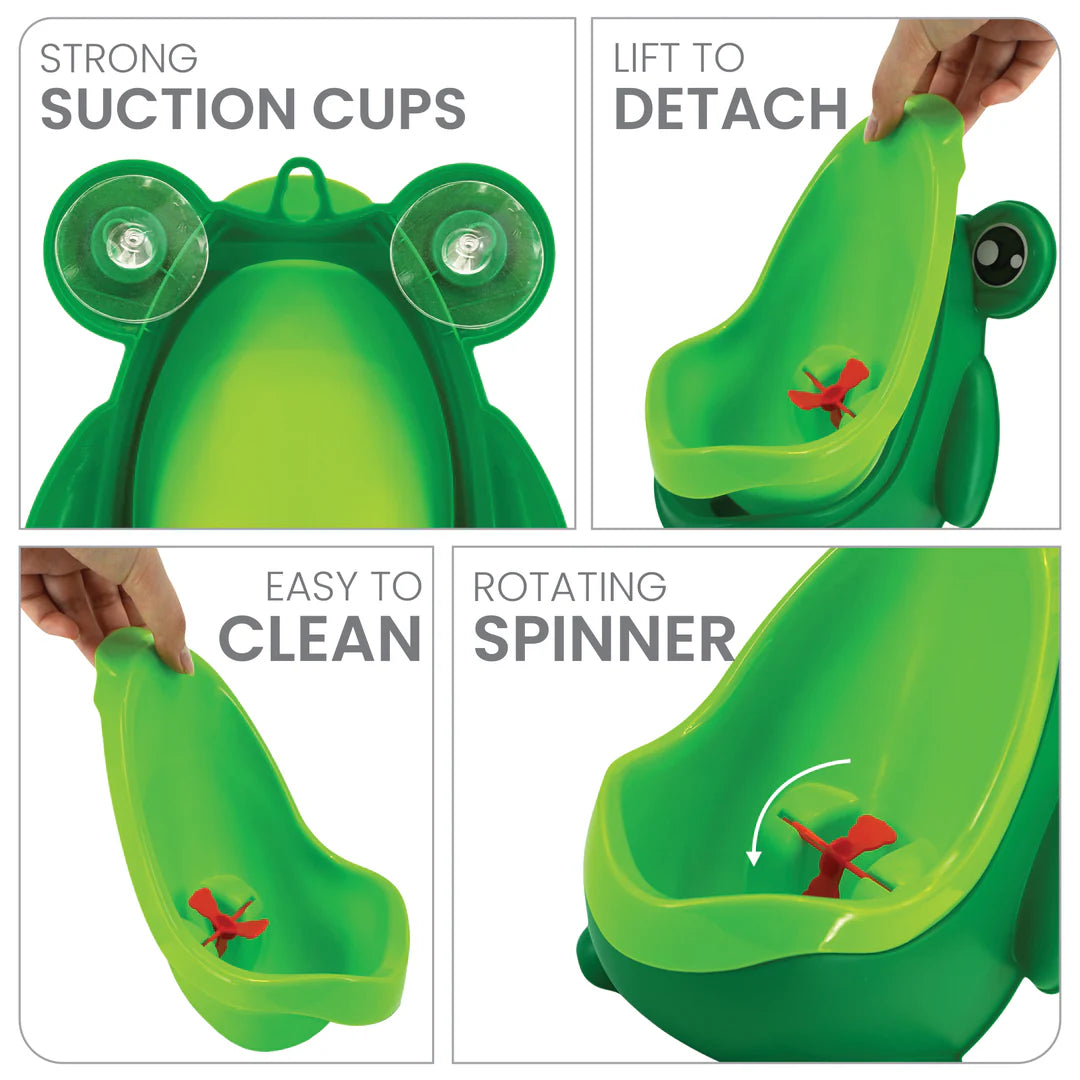Make potty training a fun and mess-free adventure with our adorable Potty Frog! Designed with bright green colors and a playful frog face, it instantly captures your toddlerβs attention and turns what used to be a challenge into a cheerful routine. The secret? A built-in spinning frog tongue target that keeps little boys focused and excited to aim properly every time β transforming accuracy into a game that actually helps them learn.